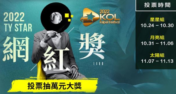 2022臺北網紅節TY Star網紅獎火熱進行中,正進行投票的星星組自即日起至10/30(日),月亮組將於10/31(一)至11/6(日)開放投票,備受矚目的太陽組於11/7(一)至11/13(日)期間啟動。